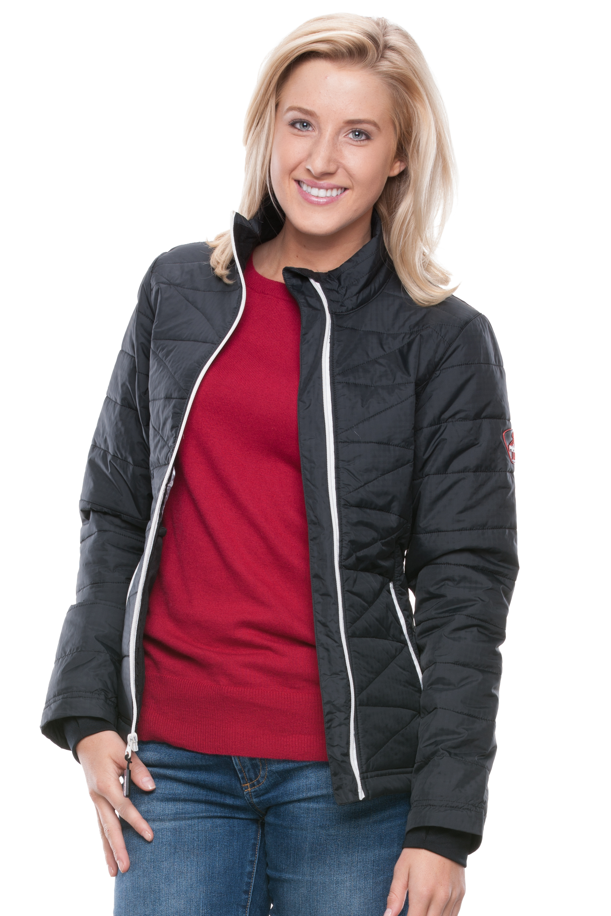 Our Women's Fitted Quilted Jacket provides major warmth with 6 oz. simulated down insulation and a super soft sateen reflective lining in sleeves and torso. The outershell of the women's quilted jacket is made of our custom diagonal quilted ripstop. A tunnel collar prevents zipper chafing, and soft inset stretch thumbhole cuffs make for a comfortable fit. Contrasting front zippers on handwarmer pockets for a stylish look.